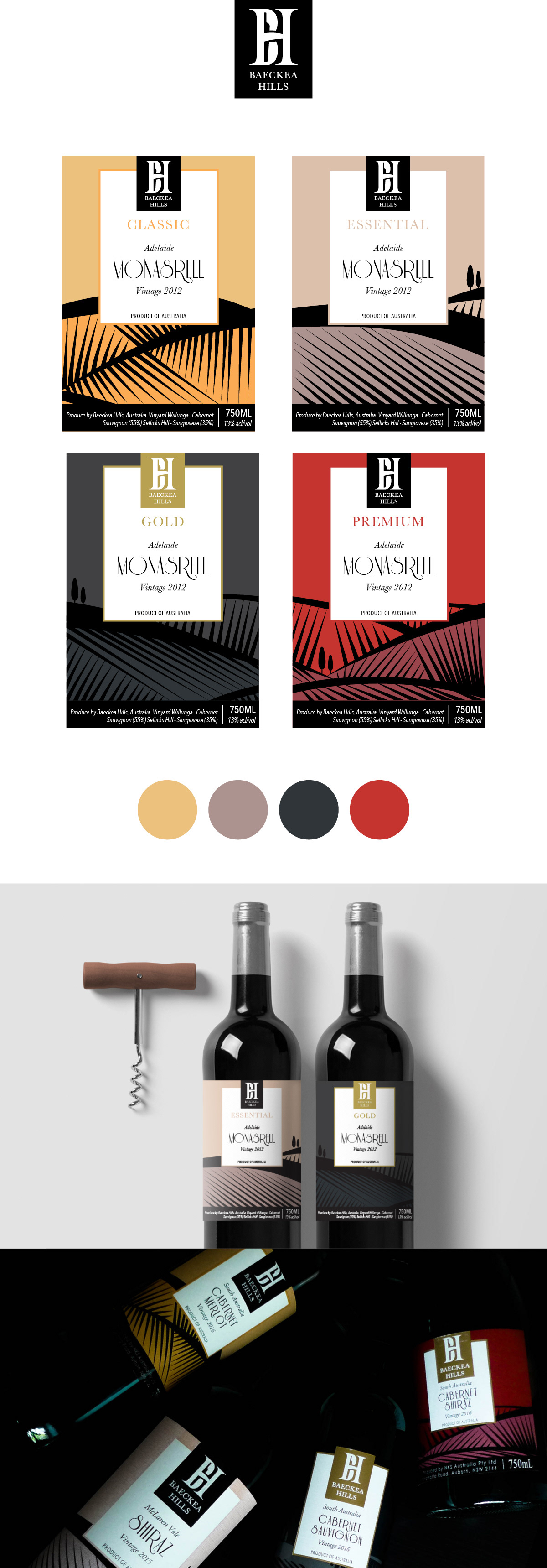 A series of wine label designs and logo design for Baeckea Hills. Labels are categorised in colours and print finishes. Scoop of work: logo & labels concept designs, choose print finishes, put together design presentation